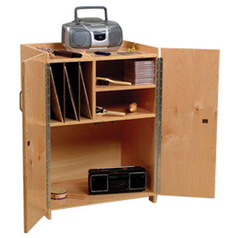 The DeFoe Standard AV Cabinet offers a secure and organized way to store and access classroom audio/visual equipment. Designed with a 1" recessed top well to safely hold a record or CD player, this unit also features generous storage space below for records, CDs, tapes, or small instruments. Built-in wire outlet, full-length piano hinges, and a magnetic door latch ensure safety and durability. A key lock is available upon request for added security.