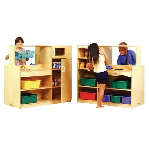 Maximize play and minimize space with the Defoe Double-Sided Kitchen Island—our most comprehensive all-in-one solution for dramatic play. This multi-functional unit features five kitchen essentials in a single compact footprint: a built-in sink with generous counter space, a refrigerator, and a microwave oven on one side, while the reverse side includes a stovetop, open shelving, and a roomy pantry for food and accessory storage. Perfect for bustling preschool kitchens or classrooms tight on space, this durable unit sparks creativity and supports collaborative, imaginative play.