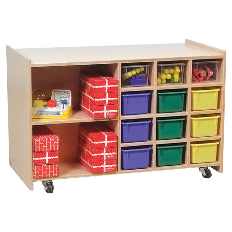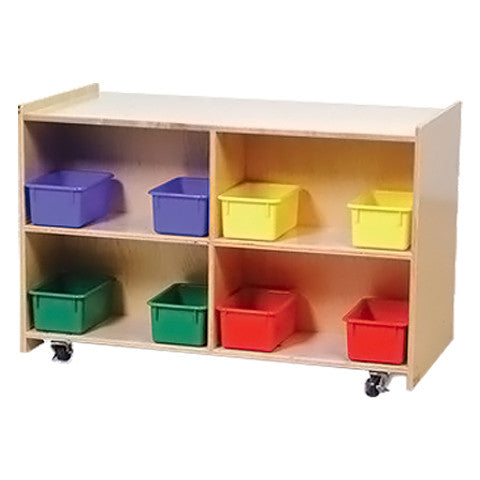 Maximize classroom storage and mobility with our Double-Sided Mobile Storage Unit. A versatile and durable solution for organizing school supplies, art materials, and learning tools. With spacious compartments on both sides, this unit provides ample double-sided storage to keep materials accessible from any direction. The smooth maple wood-grain top surface is perfect for messy activities like painting, crafting, or science experiments—simply wipe clean for easy maintenance. Its durable swivel casters make the unit fully mobile, allowing you to roll it from one classroom area to another with ease. Whether used in early childhood classrooms, STEM labs, or activity centers, this multi-purpose storage unit enhances organization while offering convenience. Built with high-quality maple plywood, rounded corners for safety, and finished with a catalyzed varnish for long-lasting use. Tubs sold separately.