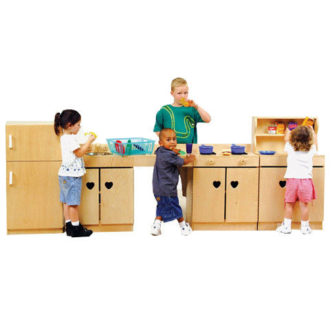 The Defoe Hutch is a charming and functional addition to any dramatic play area. Designed to mimic a real kitchen cupboard, it features open shelving above for displaying play dishes or pantry items, while the enclosed storage cabinet below keeps additional supplies neatly tucked away. Built with durability and safety in mind, it includes pinch-proof doors and child-friendly finishes—perfect for classrooms, preschools, or daycare settings.