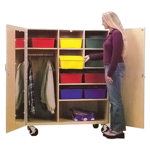 The DeFoe Mobile Teacher Supply Cabinet is a spacious and durable solution for storing everything from teaching materials to personal items. Designed with a full acrylic mirror, a sturdy hanging rod, and two large permanent interior shelves (adjustable shelves available upon request), this cabinet meets the demands of daily classroom use. Available in both 5' and 6' heights, it provides flexible, mobile storage that moves easily on locking rubber casters.