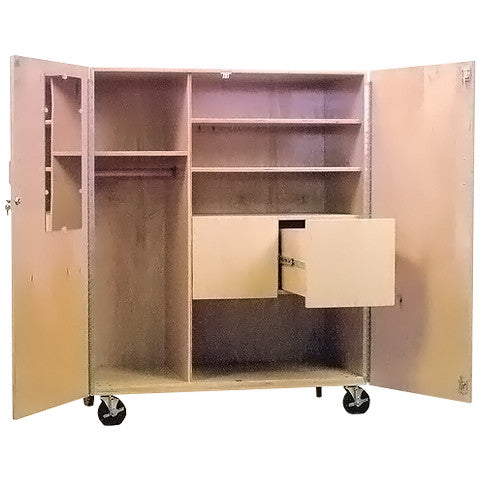 The DeFoe Mobile Teacher Wardrobe & Filing Cabinet is a multi-functional storage solution built for busy educators. This cabinet includes two full-extension file drawers, a sturdy hanging rod for garments, and a full shatterproof acrylic mirror on the exterior. Whether you choose the 5' or 6' height, this unit provides ample space for both professional and personal storage. Mounted on 5” solid rubber casters, it moves easily and locks in place when needed.