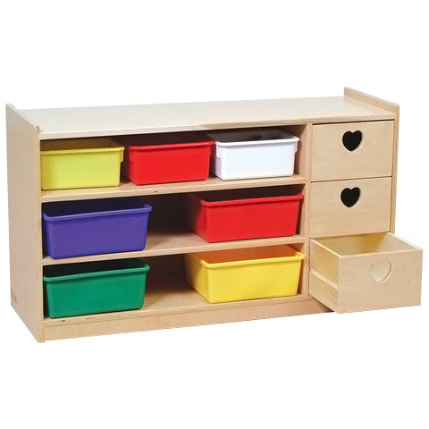 Enhance your learning environment with our versatile Science/Activity Center, thoughtfully designed to support a wide range of educational activities. This multi-functional classroom storage unit features three easy-access drawers adorned with charming heart-shaped cutouts, offering a warm and engaging aesthetic for early learning spaces. The smooth melamine work surface is perfect for messy science experiments, art projects, or hands-on learning tasks thanks to its easy-to-clean, durable finish. Below, three spacious open shelves provide additional storage space and can be used with or without plastic tubs (sold separately) to organize craft materials, lab tools, or daily activity supplies. With its functional design and compact footprint, this unit is ideal for classrooms, daycare centers, or activity rooms that require both organization and inspiration.