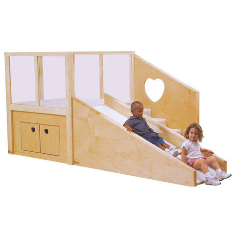Designed for growing explorers, the DeFoe Toddler Loft with Slide offers a safe, elevated space for play, observation, and social interaction. Larger than the infant version, this loft features a 6-foot whiteboard slide for added fun, see-through safety panels for visibility and engagement, and a spacious carpeted platform perfect for seated play. A locking storage compartment beneath keeps classroom supplies secure and out of the way.