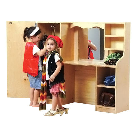 Give children the perfect space to dress up, imagine, and express themselves with the Defoe Wardrobe Vanity. Designed for classrooms and dramatic play spaces, this charming unit combines a storage closet, open shelving, and a full child-height mirror—all in one. Kids can hang up costumes, neatly organize accessories, and check out their look as they prepare for imaginative adventures. Crafted from durable materials with smooth, child-safe finishes, the Wardrobe Vanity adds both functionality and fun to any early learning environment.